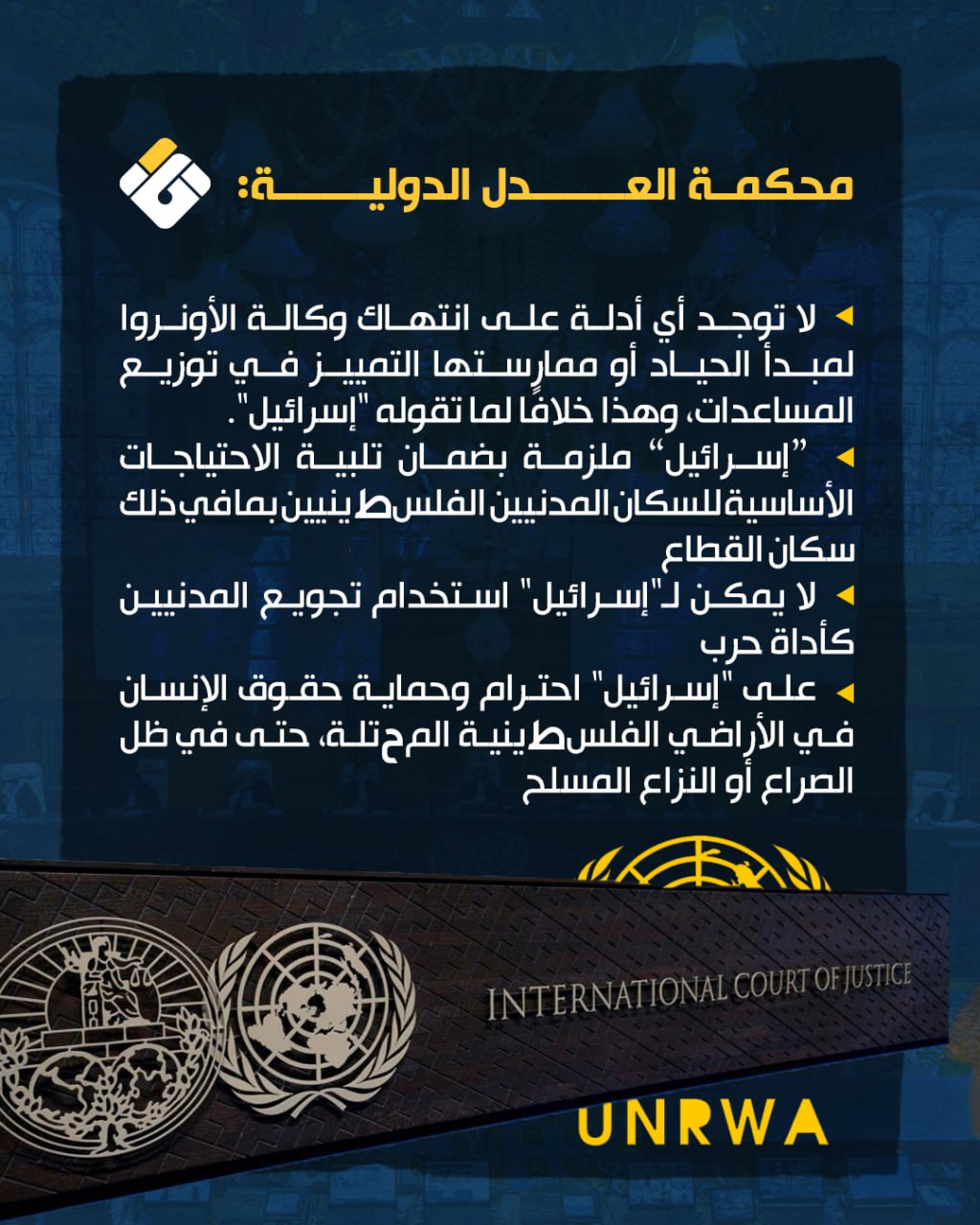 اعتبرت محكمة العدل الدولية، خلال جلسة عقدتها اليوم الأربعاء في لاهاي لإصدار رأيها الاستشاري بشأن واجبات الكيان الصهيوني تجاه المساعدات الإنسانية للفلسطينيين في قطاع غزة، أن الكيان العبري لم يثبت ادعاءاته بانتماء نسبة كبيرة من موظفي وكالة الأمم المتحدة لإغاثة وتشغيل اللاجئين الفلسطينيين (الأونروا) إلى حركة حماس.