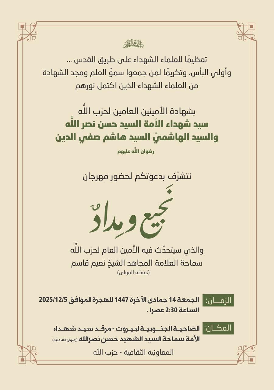 يُلقي الأمين العام لحزب الله حجة الإسلام والمسلمين سماحة الشيخ نعيم قاسم كلمة خلال المهرجان الذي يقيمه حزب الله “نَجيع ومِدادٌ” تعظيمًا للعلماء الشهداء على طريق القدس وأولي البأس، وتكريمًا لمن جمعوا سموّ العلم ومجد الشهادة من العلماء الشهداء الذين اكتمل نورهم بشهادة الأمينين العامين لحزب الله، سيد شهداء الأمة السيد حسن نصرالله والسيد الهاشمي السيد هاشم صفي الدين (رضوان الله عليهما).