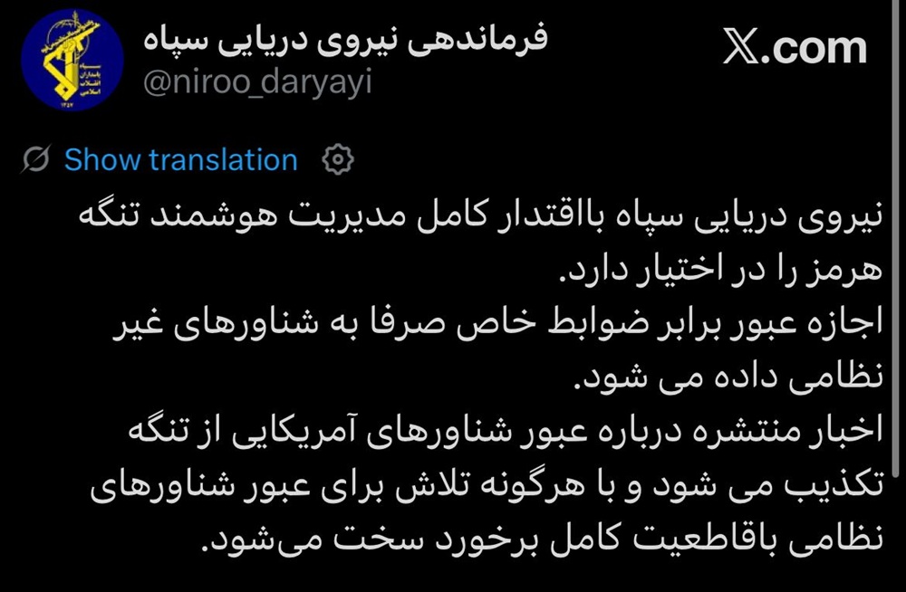 اعلنت القوات البحرية في حرس الثورة في بيان ان لديها سلطة كاملة وإدارة ذكية مقتدرة لمضيق هرمز.