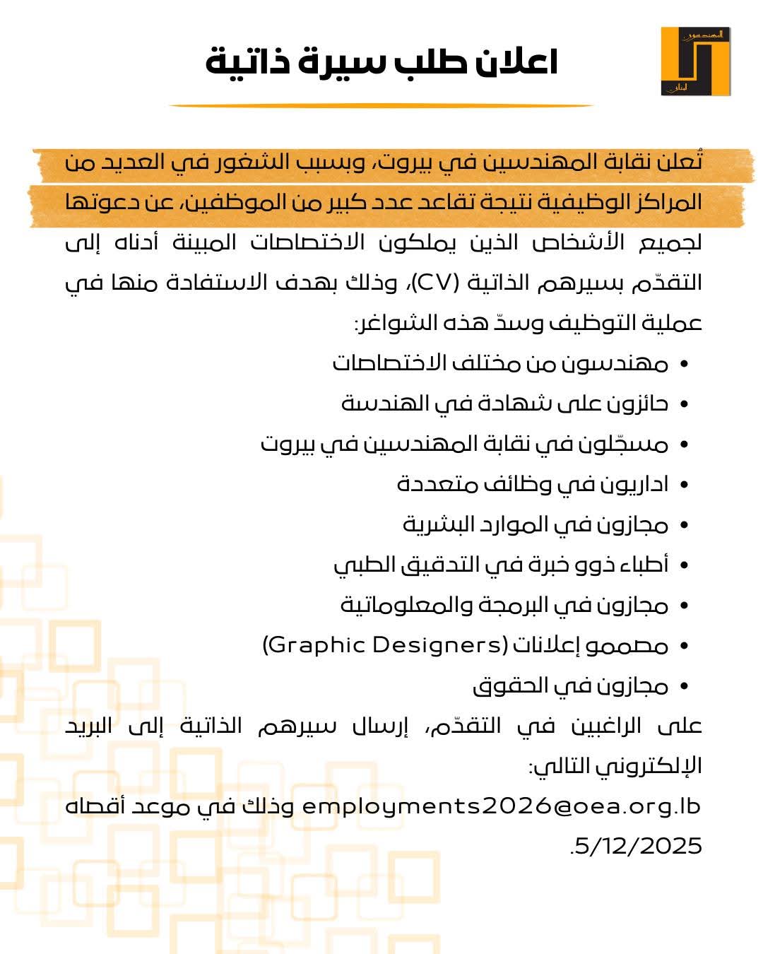 اعلنت نقابة المهندسين في بيروت، وبسبب الشغور في العديد من المراكز الوظيفية، عن دعوتها لجميع الأشخاص الذين يملكون الاختصاصات المبينة في الصورة إلى التقدم بسيرهم الذاتية (CV)، وذلك بهدف الاستفادة منها في عملية التوظيف وسدّ هذه الشواغر.