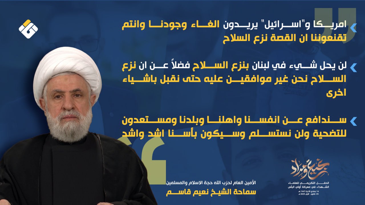 وأضاف أنه لا علاقة لأميركا و«إسرائيل» لا بالسلاح ولا بترميم القدرة ولا بالاستراتيجية الدفاعية ولا بخلافات اللبنانيين واتفاقهم وآرائهم. وتساءل: اليوم، عندما تقول أميركا و«إسرائيل» إنهما تريدان نزع سلاح المقاومة، فهل تكتفيان بنزع السلاح؟، وقال انهما تريدان نزع السلاح وتجفيف المال ومنع الخدمات وإقفال المدارس والمستشفيات وممارسة منع الإعمار ومنع التبرعات وهدم البيوت، أي أنهما تريدان إلغاء وجودنا، ثم يُطلب منا الاقتناع بأن القضية هي فقط نزع السلاح وبأن كل شيء سيُحل في لبنان. وشدد على أنه لا يحل شيء في لبنان، فضلاً عن أن نزع السلاح مرفوض من جانبهم حتى يُقبل بأشياء أخرى. وأكد: سندافع عن أنفسنا وأهلنا وبلدنا، ومستعدون للتضحية إلى الحد الأقصى، ولن نستسلم، وسيكون بأسنا أشد وأشد.