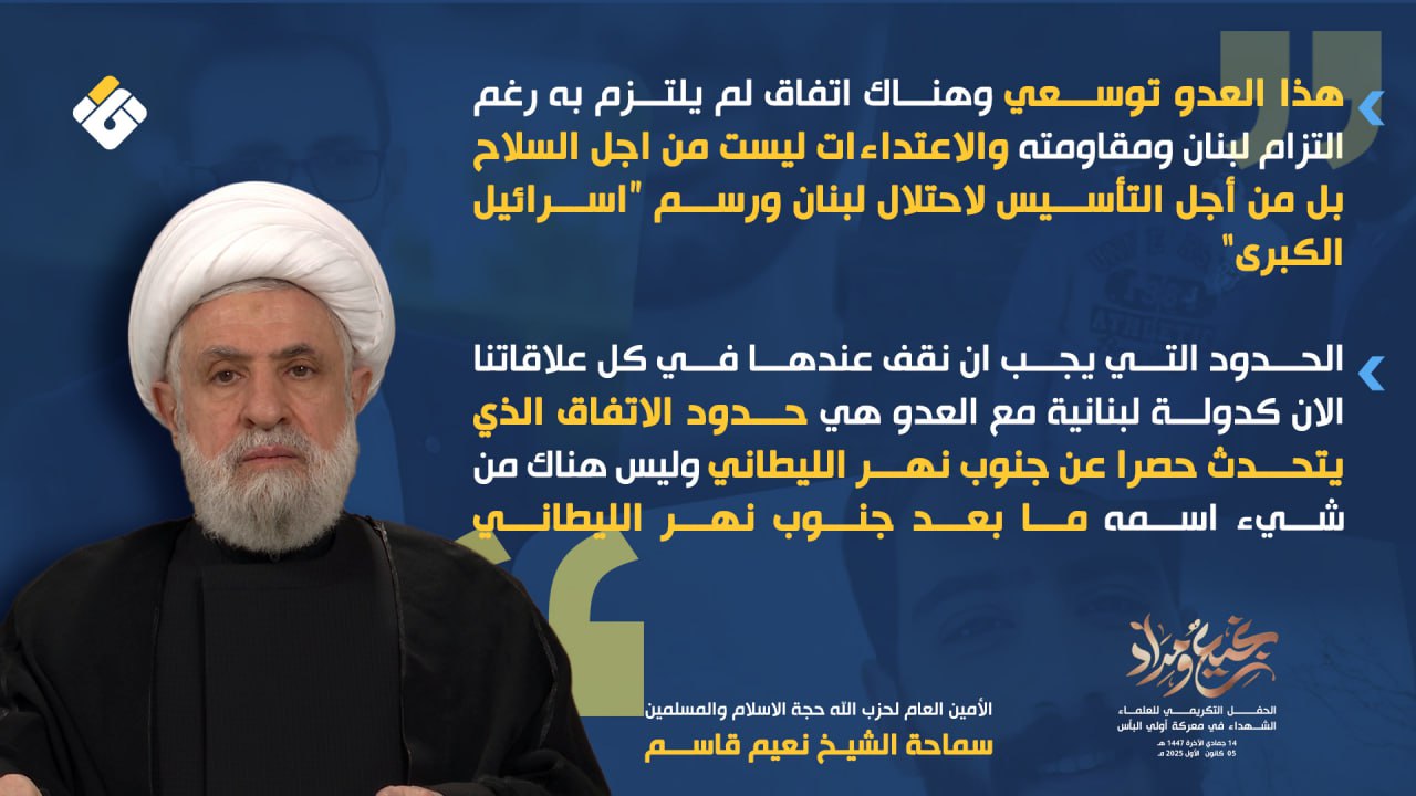 وأكد أن هذا العدو توسعي، وهناك اتفاق لم يلتزم به رغم التزام لبنان ومقاومته، وأن الاعتداءات ليست من أجل السلاح، بل من أجل التأسيس لاحتلال لبنان ورسم «إسرائيل الكبرى» من بوابة لبنان، في إشارة إلى القرار 1701 ومنطقة جنوب الليطاني.