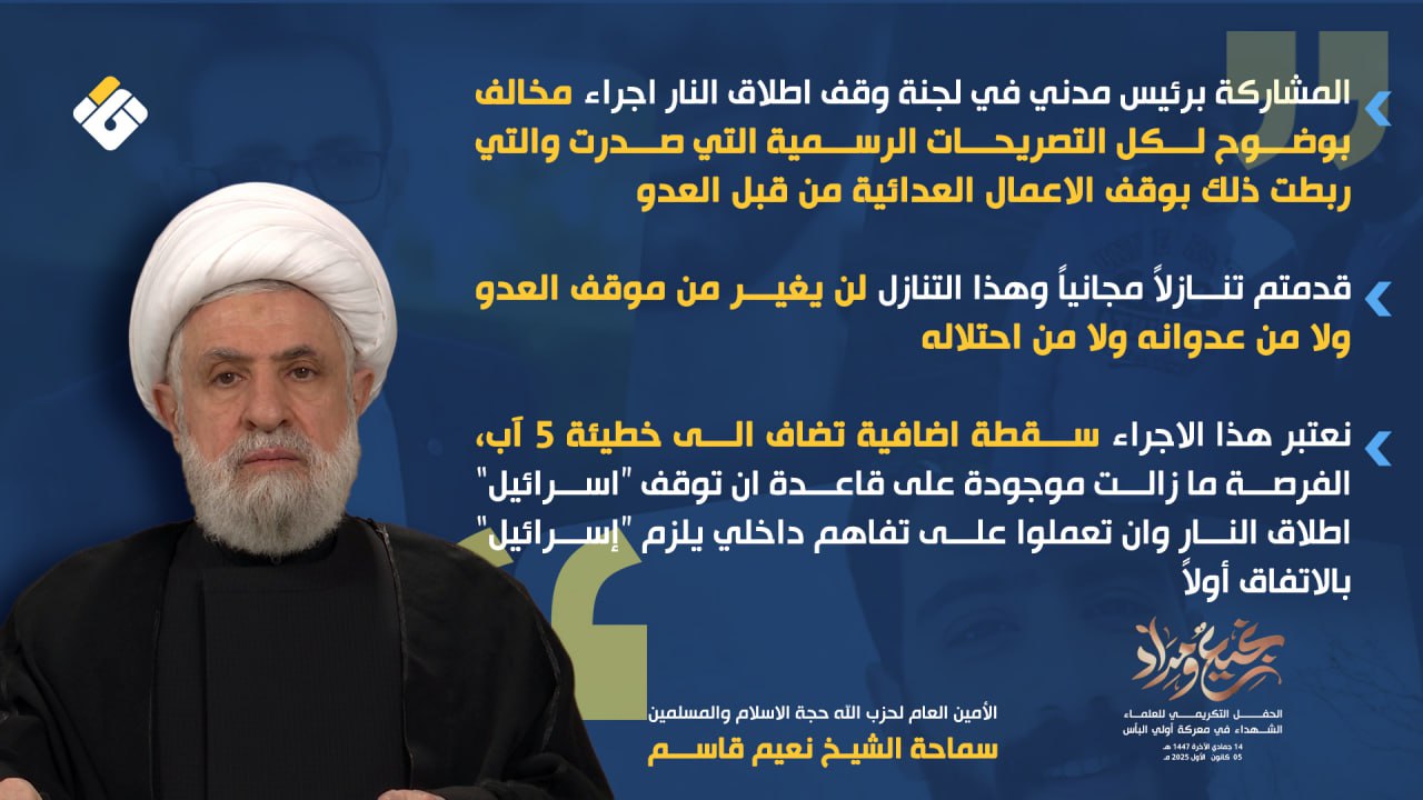 أكد الأمين العام لحزب الله حجة الإسلام والمسلمين سماحة الشيخ نعيم قاسم أن المشاركة برئيس مدني في لجنة وقف إطلاق النار إجراء مخالف بوضوح لكل التصريحات والمواقف الرسمية السابقة، التي كانت تشترط وقف الأعمال العدائية من قبل العدو قبل إشراك أي مدني في آلية التنفيذ.