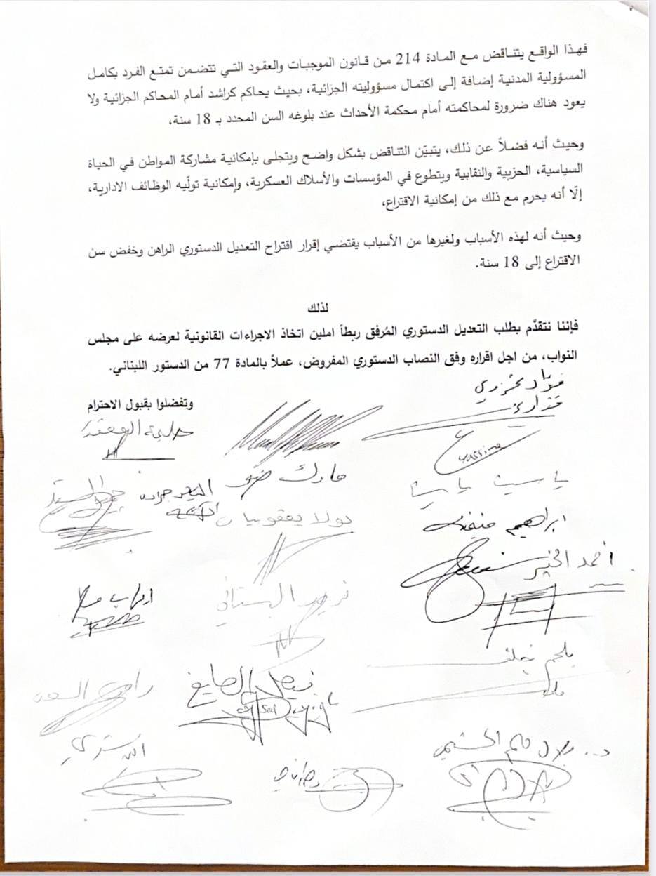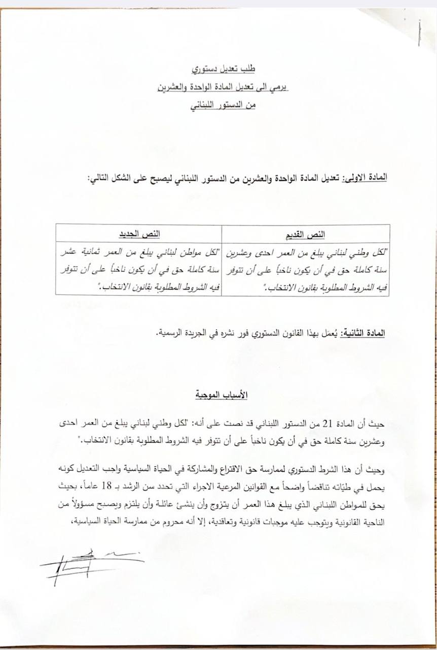 تقدّم عدد من النواب باقتراح قانون يرمي إلى تعديل المادة 21 من الدستور اللبناني، بهدف خفض سنّ الاقتراع من 21 إلى 18 عاماً، تعزيزاً لمشاركة الشباب في الحياة السياسية وحرصاً على مواءمة الدستور مع القوانين اللبنانية والمعايير الدولية.